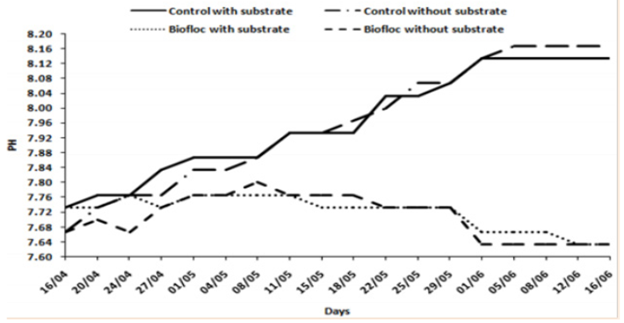 Hydrogen ion concentration (pH): The pH values in the control tanks were higher compared to the biofloc treatment tanks (Figure 2). The values in the biofloc tanks showed minor differences during the culture period ranging between 7.6-7.8. On the other hand, values in the control tanks increased relatively from 7.6 to 8.2. They remained more or less constant in both treatments (ranging between 8.13-8.17; 7.67-7.63, respectively) from the 7th week until the end of the experiment. Differences in pH values between the two treatments were significantly different (P <0.001) but not significantly different with the presence or absence of the substrate in both treatments (P <0.367).