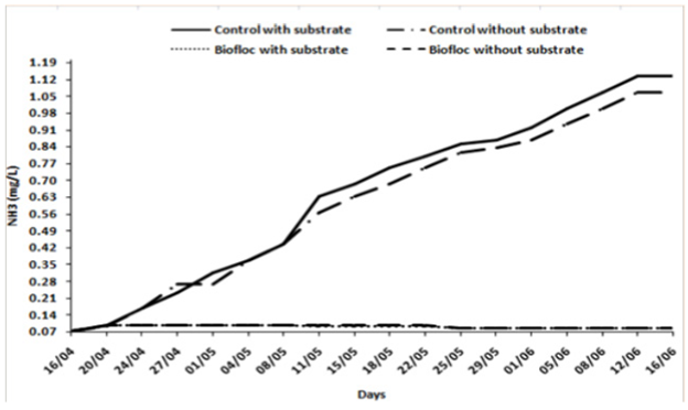 Unionized ammonia (mg/L): Unionized ammonia concentrationsin the control tanks were higher than the biofloc treatment tanks, increasing gradually from 0.07 to 1.1 mg/L (Figure 3). In contrast, ammonia in the biofloc tanks remained relatively constant (ranging between 0.07-0.09 mg/L). Concentrations in both treatments were significantly different (P <0.001), but no significant difference was recorded in the treatments with the presence or absence of the substrate (P <0.945).