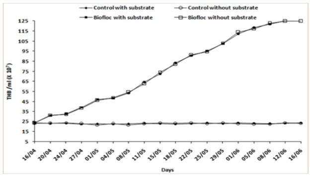 Total heterotrophic bacterial population (THB): The total numbers of heterotrophic bacterial cells in the biofloc treatment tanks increased greatly from 25 to 125 CFU/ ml (Figure 4). In contrast, their numbers in the control tanks remained more or less constant (ranging between 21 and 23 CFU/ ml). The total numbers of heterotrophic bacteria in both treatments were significantly different (P <0.001) but no significant difference was recorded in the treatments with the presence or absence of the substrate (P <0.640).