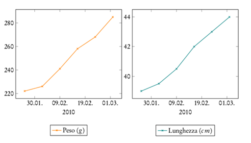 Figure 1 Chiloscyllium punctatum, Male1. Biometric parameters trend, body weight (Peso, g) and body lenght (Lunghezza, cm).