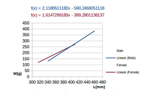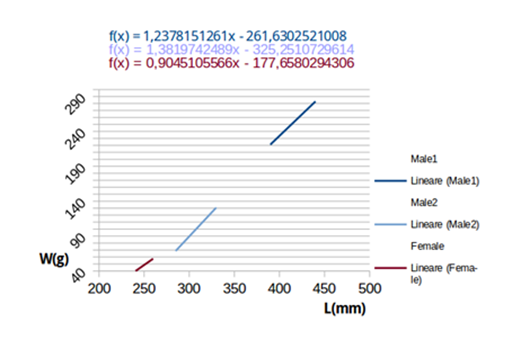Independent variable was fixed in total length because between both biometric parameters considered, it was least likely to be affected by errors. Relative errors were ignored, but absolute error was fixed on a value of 2 (grams), caused by measure instrument (the balance). Test of χ² was finally calculated to point out how functional relations of best fits obtained actually round up experimental data, according to the formula: