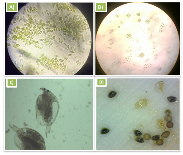 Figure 2 Images of Microcystis sp and Daphnia magna taken with a light microscope with different magnifications (A: x100, B: x40 and C: x100, respectively). The image D is a photo of duration eggs or ephippia of Daphnia manga taken in August 2018.