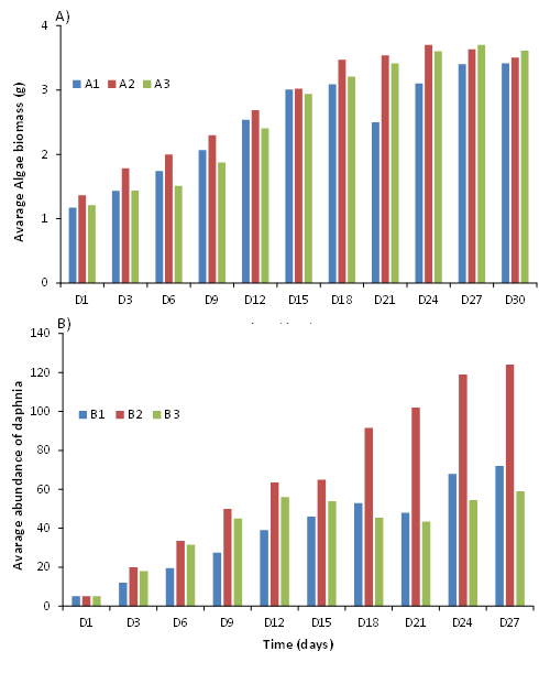 The parental strain of algae was grown in another part of the greenhouse for one month. Natural light was used throughout the culture and the parameters (temperature and dissolved oxygen) were in the required conditions. After isolation and identification of the parental strain, three bottles of microalgae culture (A1, A2 and A3) were prepared and used to feed daphnia. A1, A2 and A3 contained 1.5g, 3g, 4.5g of microalgae biomass corresponding to 0.5L, 1L, and 1.5L of microalgae, respectively.