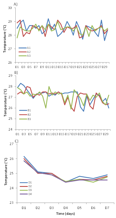 Figure 4 Variations with time of the water temperature of Microcystis sp (A) and Daphnia magna (B) culture media and Claria gariepinus rearing medium (C).