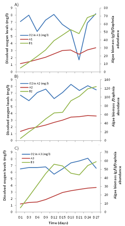 Figure 6 Relationship between dissolved oxygen levels in the algal culture medium, algal biomass and daphnia abundance.