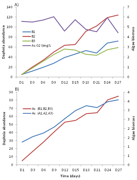 Relationship between oxygen and daphnia abundance: The average oxygen level in the daphnia culture tanks (B1, B2, and B3) ranged from 4.4 to 6mg/l (Figure 6). Daphnia abundance was not significantly correlated with oxygen content (Table 2). Indeed, an increase in oxygen level is not always accompanied by an increase in abundance (Table 2, Figure 6). However, the results show relationships between these two parameters in B2, B2 and B3 (Figure 6). Indeed, the decrease in oxygen level in B3 from day 9 to 12 is followed by a decrease in daphnia abundance from day 12 to day 21 (Figure 6C). Similarly, the decrease in oxygen level between days 18 and 21 is associated with a decrease in daphnia abundance in B1 and B3 (Figure 6A, C). In contrast, changes in oxygen level in B2 are not accompanied by changes in Daphnia abundance (Figure 6C). In B2, daphnia abundance increased with time from 1st to day 27th day.
