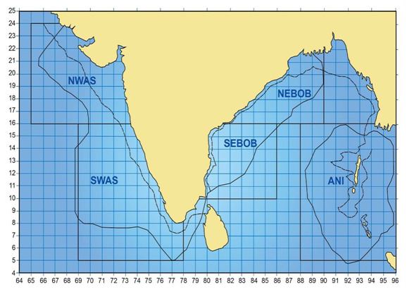 Looking at the potential of both the Arabian sea and the Bay of Bengal, it is seen that the South-east Arabian Sea (SEAS) has a potential yield of about 1.70 million tonnes (mt) comprising demersal fishery resources of about 0.42 mt and pelagic fishery resources of about 1.28 mt; the North-east Arabian Sea (NEAS) has a potential of about 1.25 mt comprising demersal fishery resources of about 0.21 mt and pelagic fishery resources of about 1.04 mt; the Northern Bay of Bengal (NBOB) has a potential of about 0.61 mt comprising demersal fishery resources of about 0.07mt and pelagic fishery resources of about 0.54 mt; the Southern Bay of Bengal (SBOB) has a potential of about 0.36 mt comprising demersal fishery resources of about 0.12 mt and pelagic fishery resources of about 0.24 mt and the Andaman Seas has a potential of 0.40 mt comprising demersal fishery resources of about 0.04 mt and pelagic fishery resources of about 0.36 mt.