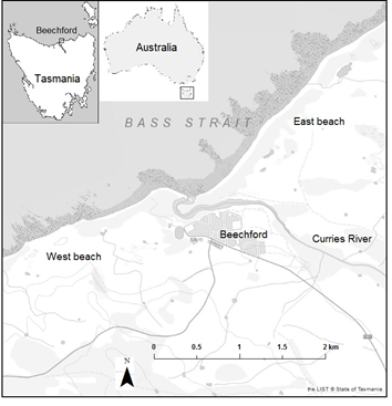 On the Tasmanian central north coast, Beechford (41o01’30”S; 146o56’42”E) is located 13km east of the main population hub of the area, George Town (population 4,347) (Figure 1). Beechford is at the mouth of Curries River, a wave dominated estuary with a small catchment area22 of 84km2. The study area extends along 3.4km of coastline, with two beaches both of north-westerly aspect, west beach extends west of the Curries River mouth for 1.6km (Figure 1), and east beach extends from the Curries River mouth to the east for 1.8km.