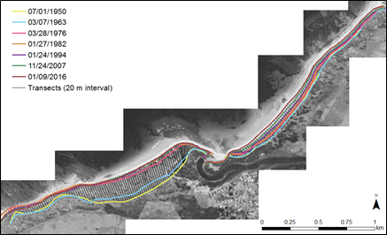 Figure 2 Historical shorelines mapped from aerial imagery and transects cast by DSAS. Background image is LIST State Aerial Photo Basemap.31