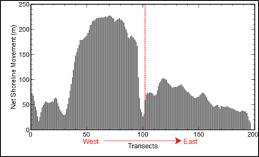 Figure 3 shows the NSM results at 20m interval transects calculated using DSAS for 1950-2016. Shoreline progradation was greatest on the west beach with greatest movement of over 200m in the central section of c. 600m beach length, reducing to below 100m progradation1950-2016 to the west, and east near the Curries River outlet (Figure 1). On the east beach, shoreline advance was lower relative to the west beach (Figure 3) with a maximum of 100m net shoreline movement east of the Curries River mouth, and reducing towards the east.