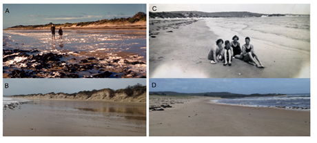 Figure 6 (A) View towards the east along the west beach during January 1960, and (B) October 2016. A seaward movement of the dunes is apparent, and transition from a low, gentle, convex incline to tall, steep, concave foredunes. (C) View towards the west along east beach in the 1930s and (D) October 2016. The east beach foredune showed a transition from native scrub to sand-binding grasses, while also having appeared to move seaward.