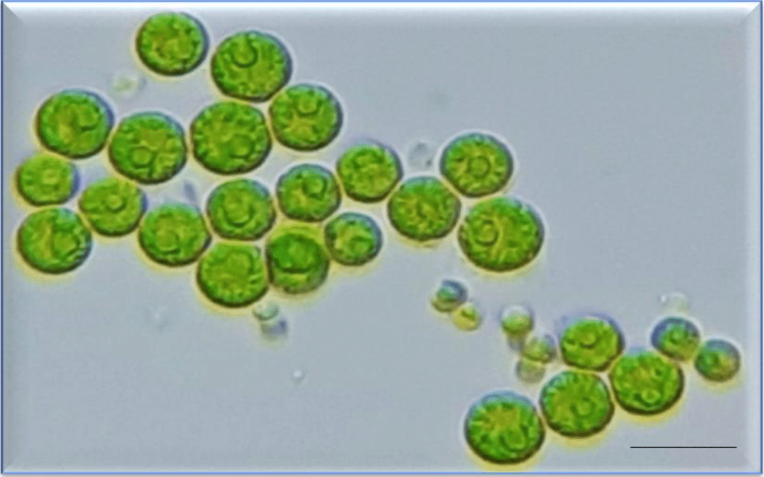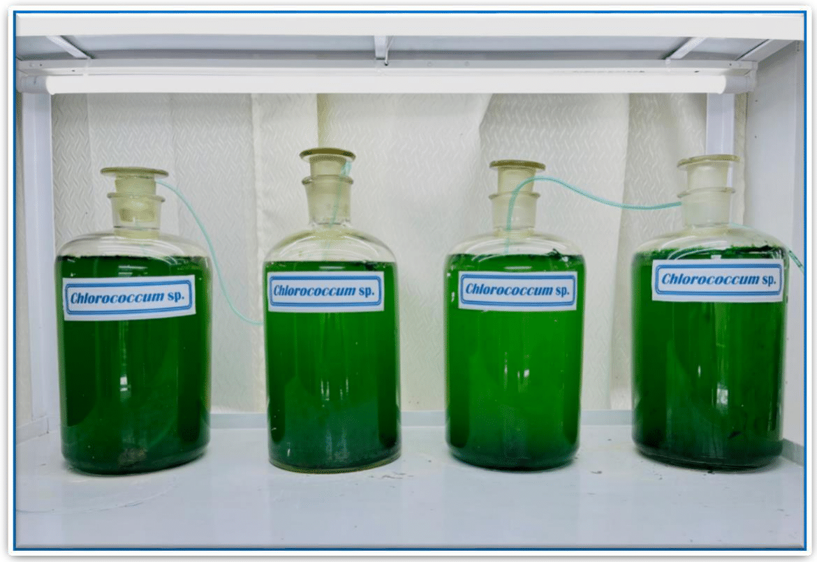 The previously maintained pure strain of the green microalga Chlorococcum sp. in the “Laboratory of Plankton Research, Department of Fisheries Management, Bangladesh Agricultural University, Mymensingh” was used for this study (Figure 1). Chlorococcum sp. was mass cultured in Bold Basal Medium (BBM) (Figure 2). Microalgal cells in the log phase of growth were harvested, centrifuged at 3000 rpm for 7 minutes, rinsed with distilled water, and resuspended in moderately hard water that was prepared by dissolving 96 mg of NaHCO3, 60 mg of CaSO4, 60 mg of MgSO4, and 4 mg of KCl in one liter of distilled water (EPA medium).33