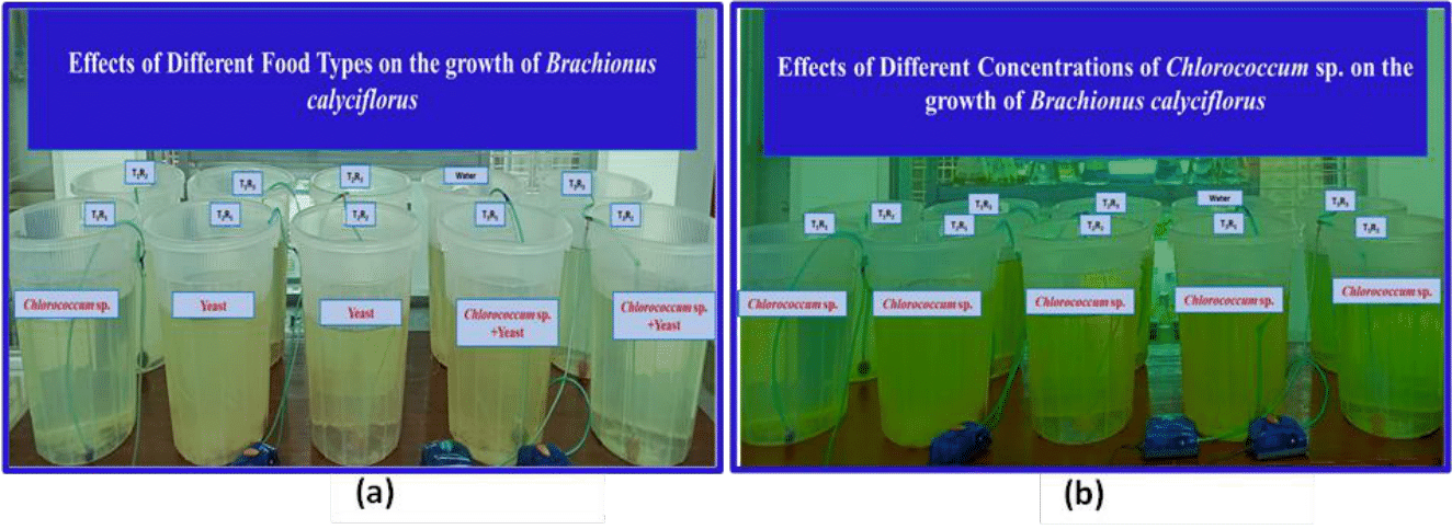 Figure 3 Experimental setups of Brachionus calyciflorus culture: (a) Feed given in Experiment 1 [T1 = Live Chlorococcum sp. (1 x 105 cells/mL), T2 = Baker’s yeast (0.2 gm/L), and T3 = Live Chlorococcum sp. 0.5 x 105 cells/mL + Baker’s yeast 0.1 gm/L, and (b) Feed given in Experiment 2 [ T1 = 0.5 x 106 cells/mL, T2 = 1 x 106 cells/mL, and T3 = 3 x 106 cells/mL of live Chlorococcum sp.].