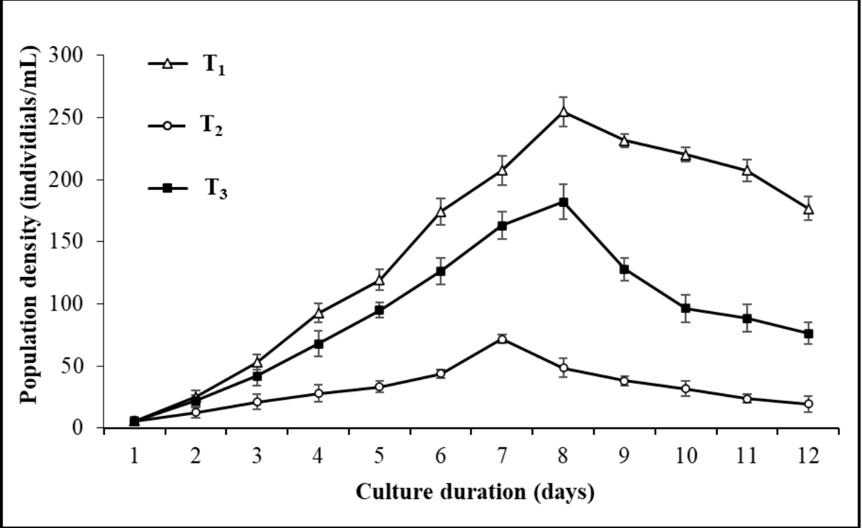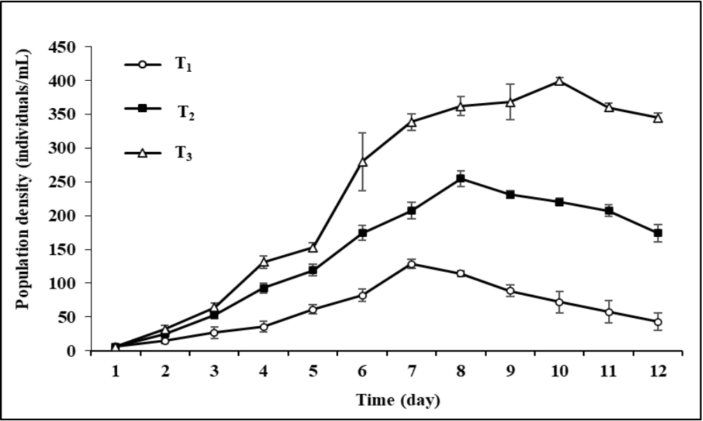 Figure 7 Population density of freshwater rotifer, Brachionus calyciflorus (individuals/mL) fed on different concentrations of Chlorococcum sp. (T1 = 0.5 x 106 cells/mL; T2 = 1 x 106 cells/mL; T3 = 3 x 106 cells/mL). Each point and vertical line represent mean ± SD for three replicates.