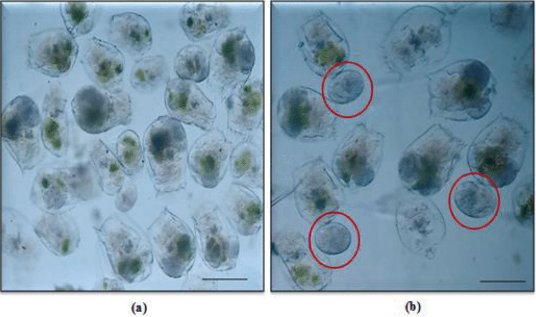 Figure 5 Micrographs showing (a) Chlorococcum fed individuals of Brachionus calyciflorus, and (b) Eggs of B. calyciflorus within red circles. Scale bar: 100 µm.