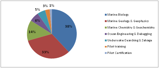 Compared with other underwater vehicles, the manned submersible can take marine biologists to the deep sea and the biologists will get a direct view to the deep-sea creatures. Some photos can be taken and some samples can also be captured and stored in bio-box. It is well known to a number of marine biologists that the American manned submersible Alvin traveled through the Panama Canal for the first time. Geology work in the Galapagos Rift was completed during February and March, 1977 .18 The major discovery of an abundance of exotic animal life on and in the immediate proximity of warm water vents prompted theories about the generation of life. Since no light can penetrate through the deep waters, scientists concluded that the animal chemistry here is based on chemosynthesis, not photosynthesis. This has opened a new century for world’s marine scientists to exploring the deep-sea creatures, especially the creatures in deep-sea extreme environment, such as the hydrothermal vents, cold seep and mid-ocean ridge areas. Marine biology exploration and research has been the main work field of manned submersibles. It was counted that from 1966 to the end of 2010, the Alvin manned submersible had dived around 5,000 times with a variety kind of applications and the use for deep-sea creatures took up 38%, which can be shown in Figure 1.