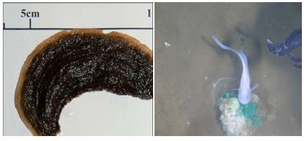 Figure 3 (Left) Unicellular protozoan; (Right) Snail fishes attracted by fish meat.20
