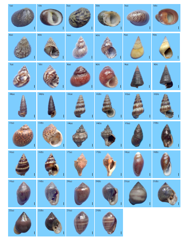 Figure 2 Gastropods:(a) Dorsal view, (b) Ventral view; Figure 1, Nerita lineata; Figure 2, Nerita funiculata; Figure 3, Dosita violaceae; Figure 4, Littoraria conica; Figure 5, Littoraria scarba; Figure 6, Littoraria melanostoma; Figure 7, Littoria strigata; Figure 8, Assiminea brevicula; Figure 9, Telescopium telescopium; Figure 10, Cerithidea cingulata; Figure 11, Cerithidea obtusa; Figure 13, Cerithidea rhizophorarum; Figure 13, Natica trgrina; Figure 14, Thais rufotincta; Figure 15, Nassarius dorsatus; Figure 16, Nassarius jacksonianus; Figure, Pugilina ternatana; Figure 18, Ellobium aurisijudaei; Figure 19,Cassidula aurisifelis; Figure 20, Cassidula mustelina; Figure 21, Pythia pantherina; Figure 22, Pythia scarabaeus; Figure 23, Melampus zonztus.