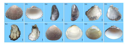 Figure 3 Bivalvess: (a) Dorsal view, (b) Ventral view; Figure 1, Anadara granosa; Figure 2, Perna viridis; Figure 3, Planostrea pestigris; Figure 4, Saccostrea cuccullata; Figure 5, Polymesoda expansa; Figure 6, Meretrix meretrix.