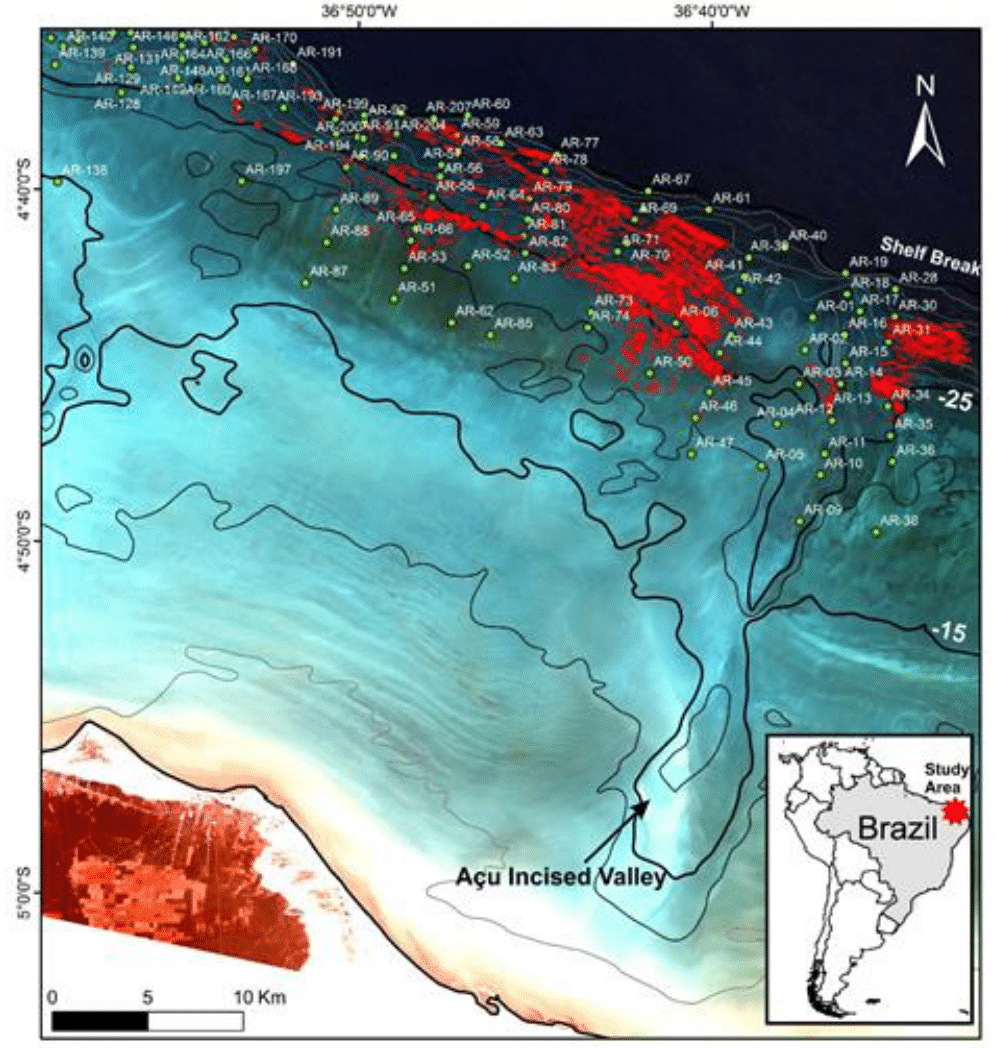 Figure 1 Samples collected along the Brazilian equatorial shelf. Mesophotic outer shelves of the Açu Reef (in red). Retired from Eichler et al.2