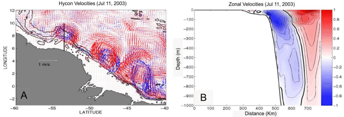 A newly offshore vortex was described in the Açu Reef northeastern of Brazil, and Krelling3 verified that besides the effect of the vortex translation across the region, the conexion in mean velocity field between the retroflexions North Brazilian Current and South Equatorial Countercurrent (and NBC-SEC), and North Equatorial countercurrent (NBC -NECC) occur due to the extension of superficial retroflexion, in certain periods, at medium thermoclinical levels, distinguishing the fate of the waters from each retroflexion.