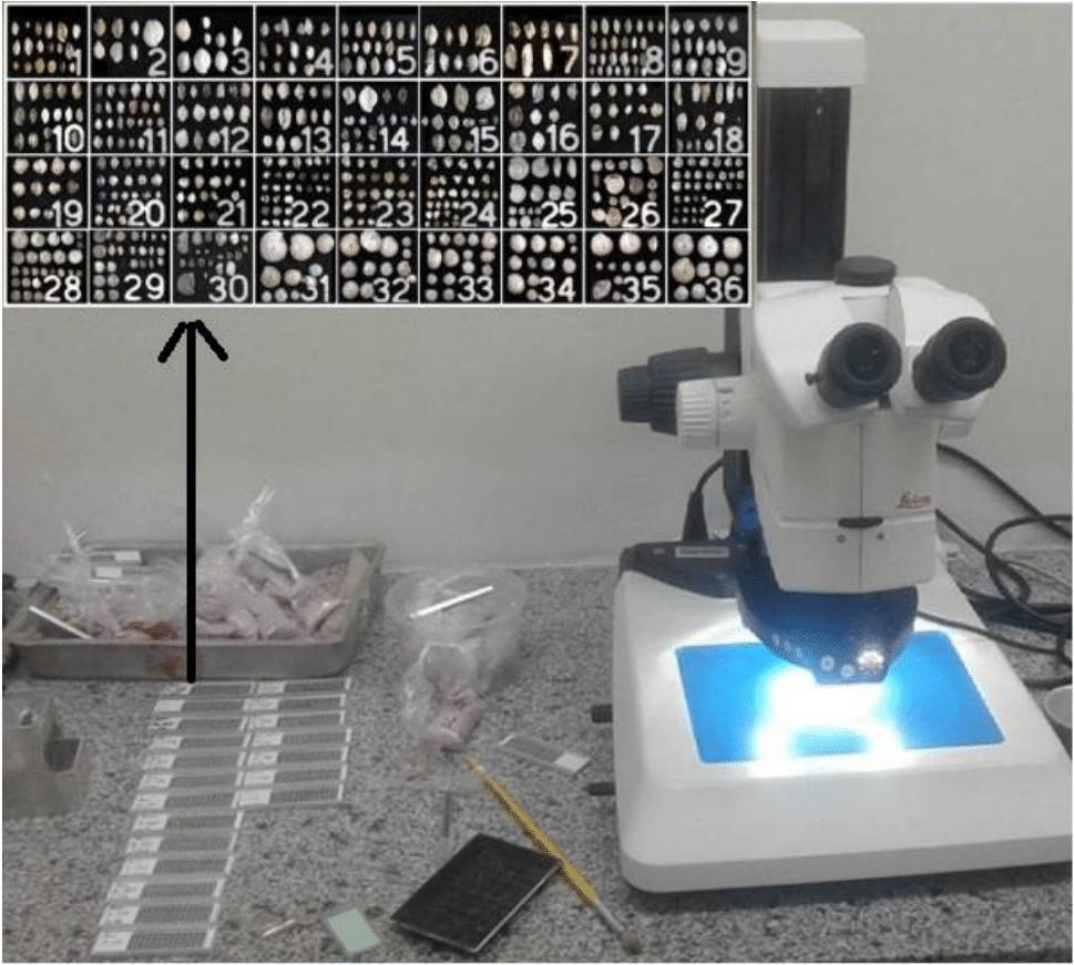 Figure 4 Laboratory stage, which included separation of the foraminifera after screening, using a petrographic magnifying glass, on a slide with a black background (next to the brush). The samples, after being quartered, were separated into plastic bags to obtain these data. At least 100 individuals of the same or different species were glued onto the smaller slides, for an absolute count of the specimens later. In the detail above, a slide as an example of the distribution of foraminifera.