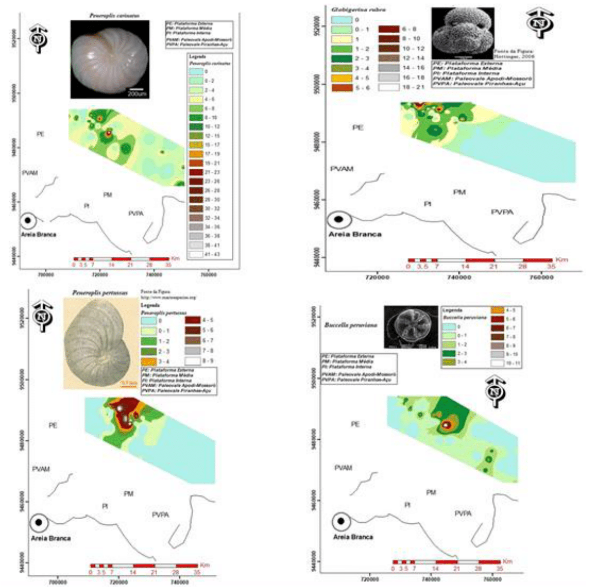 The presence of Buccella peruviana, Globigerina rubra, Quinqueloculina patagonica, Peneroplis pertussus, and Amphisourus hemprichii is probably related to the intrusion of warm waters which indicate the influence of differentiated masses of ocean water, probably linked to the balance of warmer ocean currents of the Tropical Gyre on the shelf. A phenomena of upwelling of cold water with greater nutrients enriching the shelf ecosystem can also be inferred by the presence of three species Peneroplis pertussus, Globigerina rubra, and Quinqueloculina patagonica. Globigerina rubra, an indicator of a deeper marine environment, tolerant to low temperatures, may also indicate upwelling to the west of the studied area. The distribution of Buccella peruviana in the central portion of the study area, correlating with the concentrations of CaCO3 and organic matter, indicate an upwelling zone rich in nutrients that contribute to the quality of the shelf. Species with more robust shells, such as those of the genera Amphistegina and Quinqueloculina, confirm the high-energy environment with intense marine currents on the outer shelf portion.