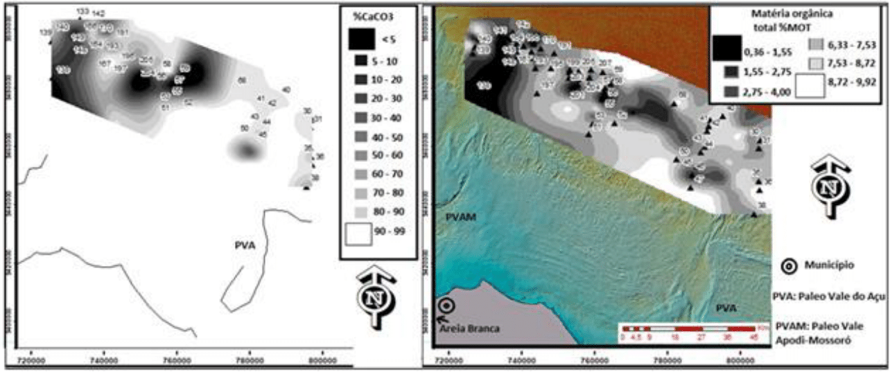 On the external equatorial shelf adjacent to the RN area, between the Piranhas-Açu and Apodi-Mossoró incised paleovalleys, it was observed that opportunistic and dominant foraminiferal species tend to concentrate in the portions with the lowest calcium carbonate contents.