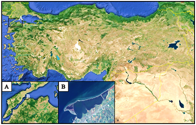 Figure 1 Sampling area of smooth scallop (Flexopecten glaber). A: Canakkale strait, Turkey; B: Çardak Lagoon as main sampling area (photos taken from Google earth, 2016).