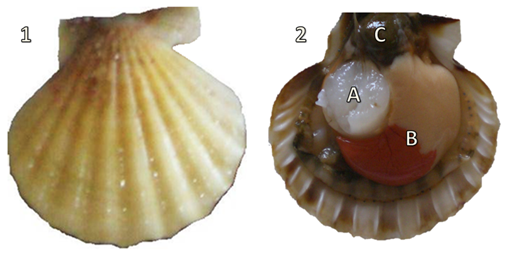 Figure 3 Morphology of smooth scallop (Flexopecten glaber), 2: Anatomy of smooth scallop (Flexopecten glaber): Adductor (striped) muscle (A)*, gonad (B), digestive gland (C).