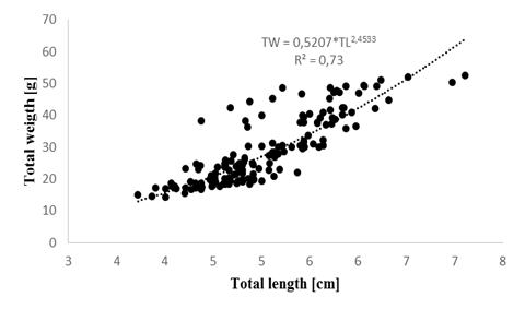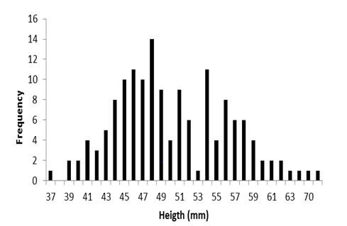 The height -weight relationship was calculated TW = 0.5207* TL 2.4533 (R2= 0.73). The total shell length frequency distributions were showed in Figure 5.