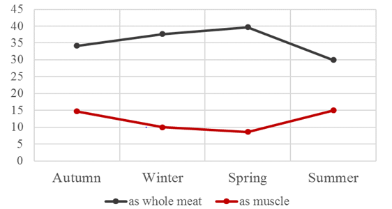In scallops, meat yield depends on species, reproduction season, feeding regime and environment like most bivalves.20 Meat yield of scallop shows variation throughout the year due to reproduction pattern6 and the adductor muscle approximately comprises 10% of its total weight.14 In this research, the meat yield of smooth scallop was determined as 34.14%, 37.63%, 39.69%, 29.96% for whole meat and 14.74%, 10.02%, 8.61%, 15.02% as adductor muscle in autumn, winter, spring and summer respectively. The ratio of whole scallop meat increased in summer from 34.14% to 39.69. However in during summer season decreased to 29.96%. On the other hand, yields of adductor muscle showed decrease in autumn and spring (P<0.05). But in summer, ratio of adductor muscle increased to 15.02% contrary to whole meat. The reason for this discrepancy was the release of gonad which had grown during reproduction season of scallops,20 between late spring and summer. Especially in spring, the gonads exceed the ratio of adductor muscles and account for half of the scallop’s wet meat. According to Mol,21 maximum meat yield of scallop is just reached before the spawning. Also, several studies have shown that the total meat weight increases owing to the growth of gonads in the reproduction season.22,23 The seasonal changes on meat yields of smooth scallop were shown in figure 6.