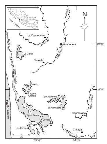 The Agua Brava lagoon is located between parallels 22°04'and 22°13'N, and 105° 28' and 105° 36'W, on the coastal plain of NW Nayarit State,14 and belongs to the Teacapán-Agua Brava-Marismas Nacionales lagoon complex, between the north/south limits of the states of Nayarit and Sinaloa,15 on the Mexican Pacific.