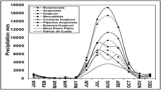 Figure 2 Monthly rainfall/climatic station in the Teacapán-Agua Brava Lagoon system, based on records provided by the Meteorological National Service.
