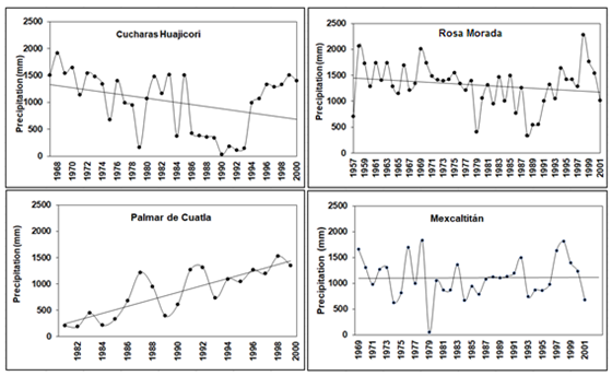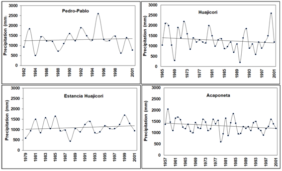 The Mesa Pedro-Pablo, Huajicori, Estancia Huajicori and Acaponeta stations are located north of the lagoon system, along the shores of the Acaponeta River. Together they account for 47% of all the rainfall. We found a tendency rainfall decrease in the Acaponeta station. The Mesa Pedro-Pablo and Estancia Huajicori stations showed a tendency to rainfall increase from 1989 to 1995, and in 1981, 1983, 1985, 1993 and 1999 (Figure 3).