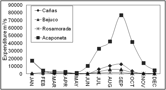 Figure 5 Monthly flow of the Cañas, Bejuco, Rosa Morada, San Pedro and Acaponeta rivers (data provided by CNA).