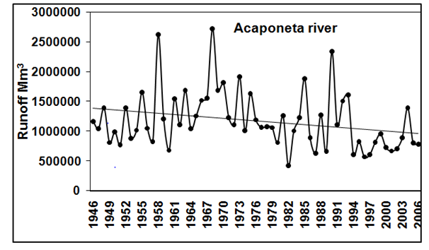 Runoff from the four rivers has shown an inter-annual behavior similar to that of rainfall, as both have been influenced by meteorological processes like cyclones and the El Niño phenomenon. Magaña et al.32 mention that rainfall deficits can occur during El Niño summers in the rainy season, when the decrease in rainfall has been remarkable. According to these authors, the most affected region in terms of water availability is the North Pacific, where El Niño and monsoon years that weaken runoff rendering it below normal. This condition is not normal, only in certain years.