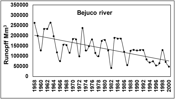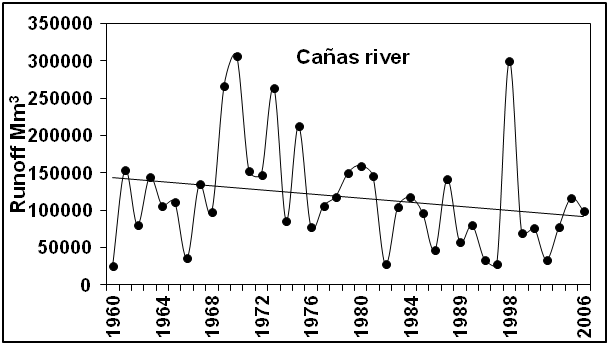 Runoff of the Acaponeta river decreased during a 61-year period and lost approximately 6.9 mm3 (Figure 7). Runoffs with the most water occurred in 1958 (with El Niño), 1968 (with La Niña-El Niño) and 1990 (El Niño-Neutral Phase). Time series variations show differences in between years, with higher than average runoffs, followed by one or more years with similar or smaller runoffs, with the exception of the period 1961 to 1975 in which higher than average levels prevailed. A later period showed an interval of constant decrease, from 1976 to 2006, explained by scarce rainfall as recorded during the last decade to recent times when El Niño, La Niña and the Neutral Phase occurred indistinctly. This trend is also caused because more water is being extracted (upstream) for agricultural uses. According to the council of the Presidio River basin in San Pedro (2006),there were376 users (general public, agricultural, industry, services, livestock and aquaculture) of the Acaponeta River which altogether, extracted 19,060.5 mm3of water, approximately 85% of which was used in aquaculture and the remaining 15% in other activities. During a 35 years period in which records were taken, the runoff tendency from the Cañas river decreased by 2 mm3 (Figure 8). The highest runoff s occurred indistinctly during 60´s (Neutral Phase), 1970, 1973 and 1975 (La Niña), and the lowest in 1966 (El Niño-Neutral Phase) and 1982 (El Niño).