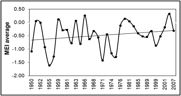 Figure 11 El Niño years with higher frequency and intensity (based on the Multivariate ENSO Index (MEI) and perceptible on coasts of Nayarit with regards to the La Niña phenomenon (Figure 12), there was no clear trend of its intensity and frequency however, MEI years with high negative values were recorded, and considered La Niña high intensity years (1955, 1956, 1971, 1974 and 1975) with annual duration. These years did not show changes in rainfall intensity.