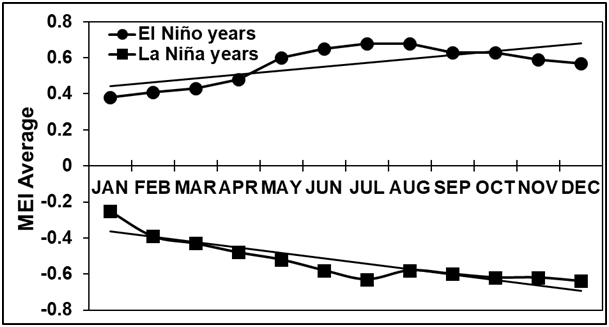 Figure 13 Average monthly El Niño (A) and La Niña (B) over a 57-year period (based on http://www.cdc.noaa.gov/people/klaus.wolter/MEI/mei.html).