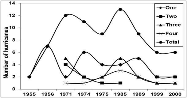 Both the El Niño and La Niña phenomena can directly or indirectly influence the frequency and intensity of meteors such as tropical storms and hurricanes. The Teacapán Agua Brava lagoon system is part of the Central Pacific region (Nayarit and Jalisco), an area affected by tropical storms and hurricanes mainly from May to October with a higher incidence in September. Some of these disturbances run parallel to the coasts of the Mexican Tropical Pacific, while others go further in and modify rainfall and river conditions.17 During El Niño and La Niña years considered to be strong (Figure 15 & 16) there were a total of 83 and 74 hurricanes respectively at ocean level. From 1982 to 1983, and 1992 to 1993, El Niño increased the number of category four hurricanes; during the last period, we had one of the longest El Niño events, which allowed the warm water to remain like that for a longer period of time thus increasing the frequency and intensity of hurricanes Gallegos-García et al.44 and Magaña et al.34 suggest that this warm water anomaly during El Niño years reaches the Mexican coasts, which might be the reason why hurricanes intensity in this region increases, although on average, they remain further away from the Mexican coasts. The impact of hurricanes on the Pacific have become more frequent on coastal areas northeast of the country in places like southern Sinaloa (near to Nayarit), and their effects can be felt in the area of Tecapán-Agua Brava and Marismas Nacionales. Jáuregui45 mentions that during a 50 year period, the hurricanes that hit the Pacific coasts increased in number during the last decade; although the author does not state the causes for this increase, it might be possible it is explained by the eight years of El Niño conditions that prevailed during the 90's. In the years considered as intense LA Niña (Figure 14 & 15), category one hurricanes predominated, possibly because the ocean temperatures tended to be low, which did not allow an increase in the intensity of the hurricanes as seen during the El Niño years. It would be expected that an increase in hurricanes would be reflected in increased rainfall, but this has not been the case, as hurricanes have developed further away from Mexican coasts, and the cloud fields generated by the cyclone do not reach the mountain slopes, only the areas near the coast, as seen in the Palmar de Cuautla station, with a tendency to increased precipitation. Pavia27 mentions that rainfall may not be directly associated with cyclone intensity or with the location of its eye or its duration, but rather with the cloud field it creates, as it may rain before or after the cyclone. Rainfall, on the other hand, is associated with the monsoon effect.