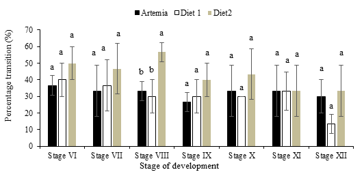 The Percentage transition of larvae to the day of emergence of new stage in the three treatments showed similar results between treatments except at the appearance of stage VIII where T2 was significantly different (P<0.05) from TA and T1 (Figure 2).