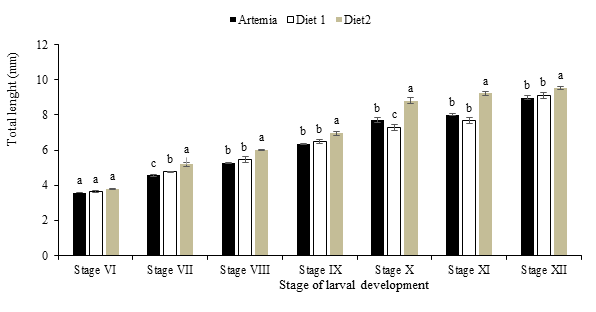 The length of larvae from stage VI to postlarvae showed significant difference between treatments from stage VII onwards (Figure 3) with larvae in T2 having the highest length while those from TA and T1 were very similar, except at stages VII and X.