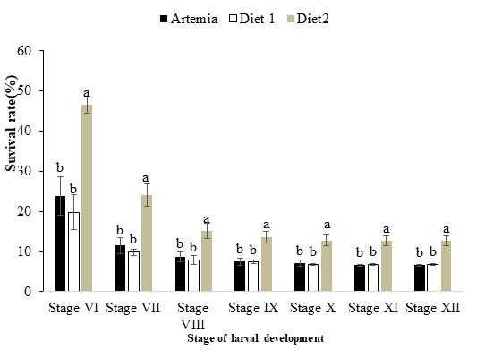 The survival rate at the appearance of each larval stage till post larvae showed significant higher survival in T2, while TA and T1 were similar (Figure 4). It also appeared clearly that more than 50% of larvae died between the transitions from stage V to VI while the survival rate in all the treatments was more stable from stage VIII onwards.