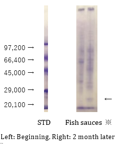 Immediately after preparation of the fish sauce and 2 months later, the protein bands shifted to lower molecular weights, and after 2 months, peptide bands with molecular weights of about 25,000 to 20,000 were observed, indicating protein breakdown. These results suggested that peptides and amino acids were produced during the maturation process.