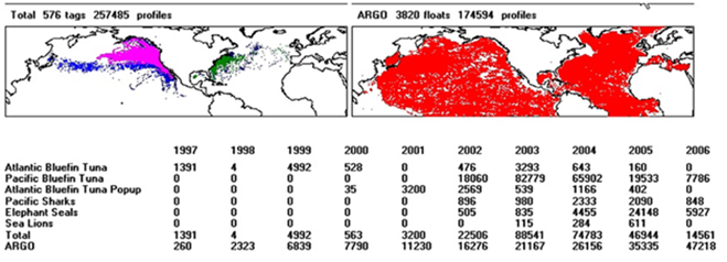 Sharp introduced Douglas McLain to Barbara Block and both suggested that the ongoing expansion of archival tagging of ocean pelagic species provided real world observations offering a real solution to this problem, if these programs’ instrumental data were to be entered into the global ocean data bases. Amongst the most promising of the ongoing efforts has been the CoML/TOPP Tagging of Pacific Pelagic species, outfitted with sensors and satellite tracking/information transfer gear (Figure 6). TheCoML/TOPP websites offers a full description of what has been learned and where the future efforts will be focused: