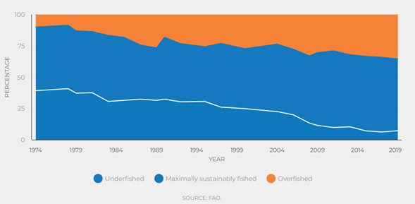 The recent history of fishing exploitation worldwide indicates, according to the FAO,1 that with every passing day (Figure 1), the number of populations exploited below their biological production capacity is increasingly smaller. Similarly, the number of resources exploited at full capacity is very high and this proportion has been maintained with a slight increase over the years. Finally, the number of overexploited and depleted populations increases over the years and over time, the risk of becoming extinct becomes greater. Society should take decisive action to prevent this from happening, since species that become extinct as a result of human activities constitute an irreversible loss of their genome.
