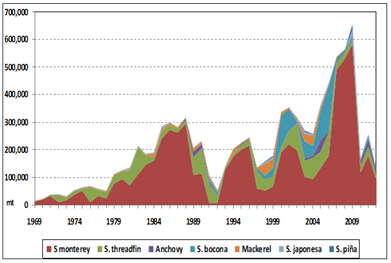 The assessment of the Monterrey sardine stock shows that the oscillating catch also corresponds to that of the biomass of this population which are equally variable (Figure 3); here, its biomass values show a notable increase since 1973, reaching up to 5,000,000 t in 1992. After that year, the catch is close to 2,000,000 t.