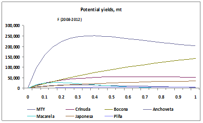 When examining the population trend, it is noticeable to perceive that the potential catch of the species can reach almost 250,000 t with a fishing mortality which is proportional to the intensity of fishing, of F = 0.25. The production of the other species is secondary. The current catch is located very close to the maximum that could potentially be obtained; it is at a level of F = 0.24, while the maximum potential would be obtained at F = 0.35.