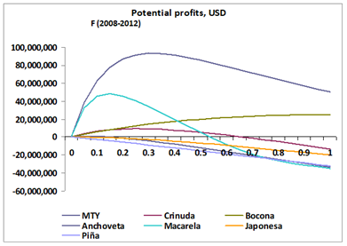 When economic returns of the fishery are examined, which are obtained by transforming the catch data into its equivalent value, less the cost of fishing operations, the resulting picture changes a little than in the former case and it is perceived that the economic return of mackerel is evident, although not with the importance of the Monterrey sardine, whose maximum potential would be a little below from the so-called Maximum Economic Yield, which is higher than 90 million dollars (Figure 4). It is important to note that the value of the catch of incidental stocks is minimal and shows often negative values.